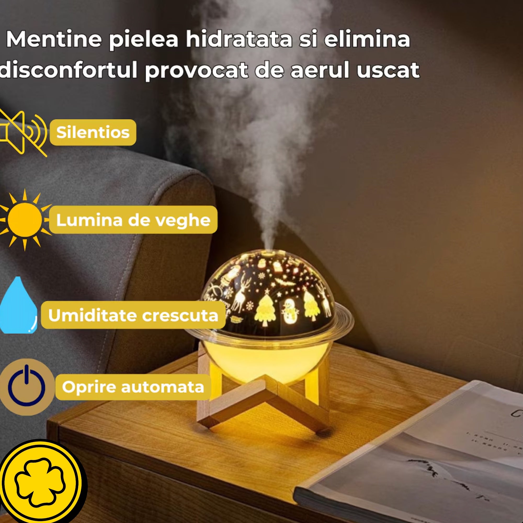 Acest umidificator in forma de planeta are rezervor de 250 ml si functioneaza cu ultrasunete pentru a produce ceata fina.