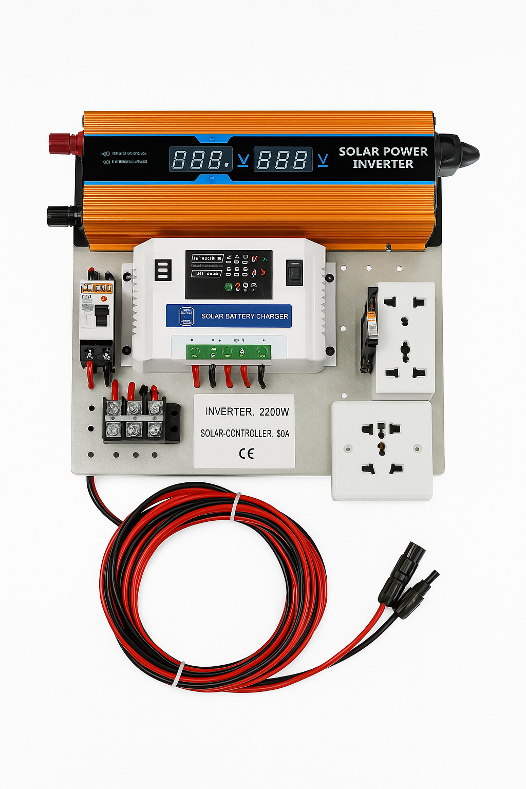 Setul include un invertor de 2000W si un panou solar monocristalin de 100W, pregatite pentru conectare imediata.
