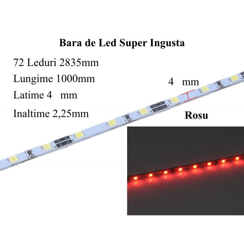 Bara LED pe aluminiu de 12V, 2835, cu dimensiuni de 1000mm x 4mm si lumina rosie intensa, este solutia perfecta pentru proiecte de iluminat decorativ sau functional.