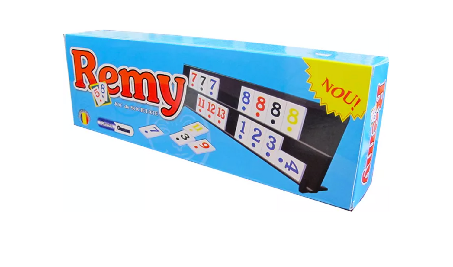 Joc de socializare Remy este un joc de societate cunoscut, apreciat si distractiv, ideal pentru a petrece timpul cu familia si prietenii. Jocul de remy este un joc recomandat atat adultilor, cat si copiilor, deoarece ajuta la dezvoltarea abilitatilor de concentrare, atentie, organizare, asociere si socializare. Jocul contine: 104 piese in 4 culori numerotate de la 1 la 13 (cate 2 piese din fiecare numar si culoare), 2 piese Joly, 4 table de joc si 8 suporturi din lemn. Numar de jucatori: 2-4.